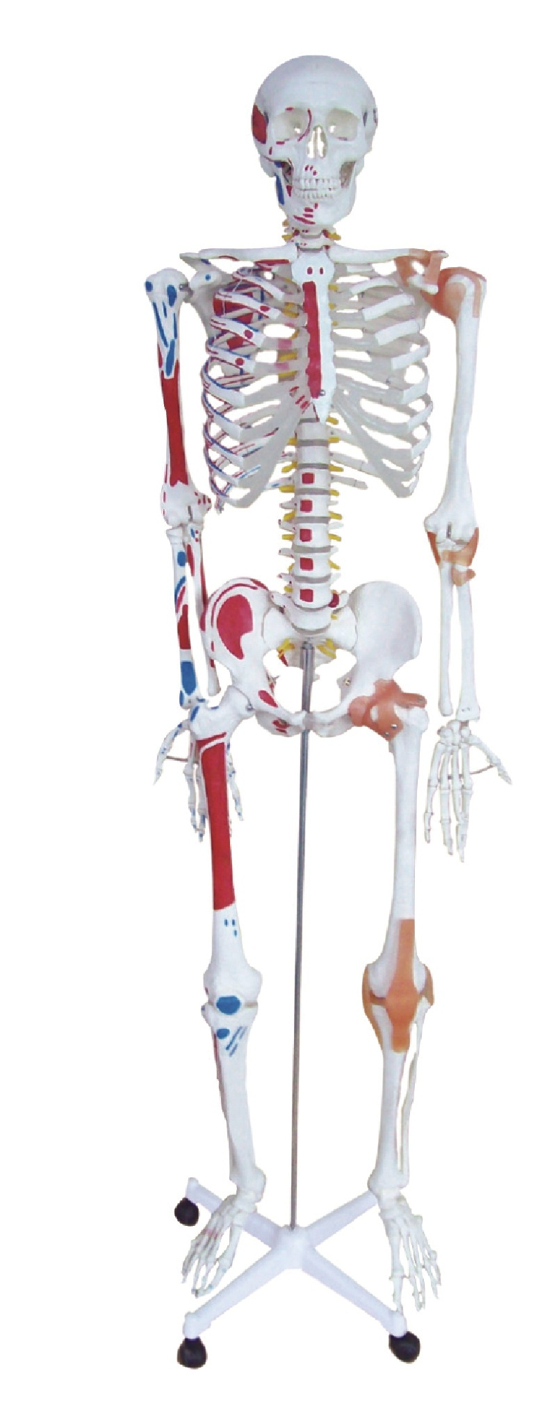 ■ 功能:顯示男性全身骨(gǔ)骼的組成和形態外觀,其中四肢骨可以靈活組合,頭顱骨和靈活組裝(zhuāng),固定在(zài)支架上,帶底座,可(kě)靈活移動。左半(bàn)側骨骼用不(bú)同(tóng)顏色油漆標識出肌肉起止點位置,右半側為上下肢附關節韌帶;