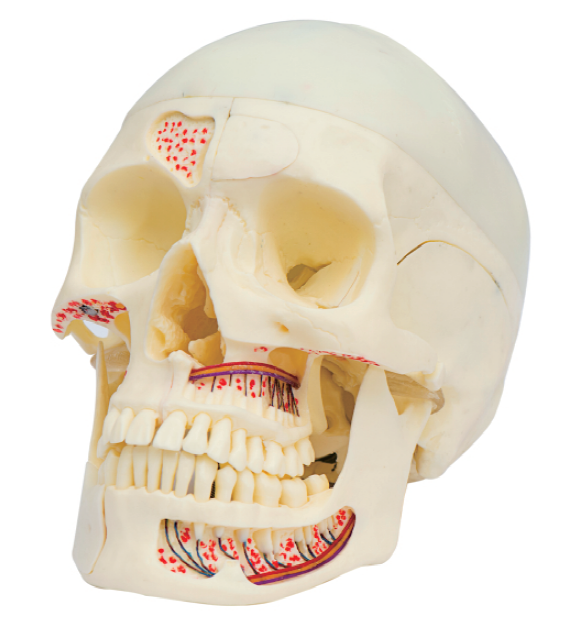 ■ 功(gōng)能:模型由10部件(jiàn)組合成(chéng)顱(lú)骨,用顏色表示顱內血管分布,同時分(fèn)解後可清晰觀察到(dào)顱骨內外的結構;
