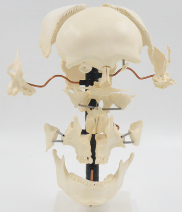 功能:模型顯示分解的22部件顱(lú)骨形態結構串製於鐵絲上,用於說明22部分顱骨(gǔ)的名稱;