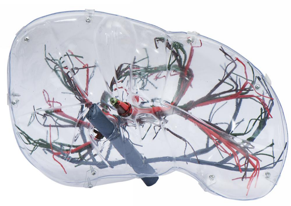 ■ 功能:透明有機玻璃外形(xíng)顯(xiǎn)示(shì)肝外形特征,白(bái)色標誌線示(shì)肝髒分葉分段,內部分配肝內各管道(dào)係統,包括:肝動脈係統(紅色)、門靜脈係統(紫紅色)、肝內膽管係統(綠(lǜ)色)、肝靜脈係統(tǒng)(蘭色),各管道係統均達三級分支,以(yǐ)顯示與肝髒分葉,分段(duàn)的關(guān)係;同時顯示第一、二、三肝(gān)門的位置、內容,及經由第一肝門(mén)進出的肝動脈,門(mén)靜脈和肝管及其分叉不的相互位置關係;
