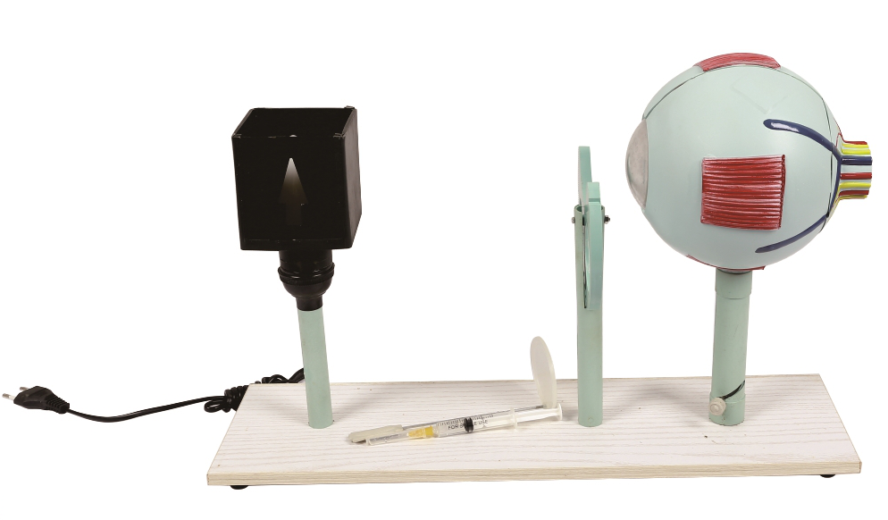 ■ 功能:產品由成人眼球、光源、校正鏡(jìng)片、活(huó)動成像顯示屏及底座組成。通過眼球前後及在正中與水平成75°切麵,示眼球壁(bì)三層被膜, 眼球內晶狀體(可(kě)改變曲率),玻璃體和虹膜。由外向內三層被膜做成梯形切麵,並示其各部結構。在眼球後部裝一垂直眼球軸的剖麵,以示視網膜成像(xiàng),可調(diào)節晶狀體,示遠視、近視成像;