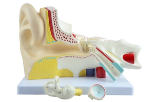 ■ 尺寸:放大3倍;■ 部件:3部件,固定在底(dǐ)座上;■ 功能:模型顯示了外耳、中耳和內耳的細節。帶錘骨、砧骨和鐙骨的鼓膜是(shì)可拆卸的。另一部分由耳蝸和迷路及前庭神經和耳蝸神經組成;
