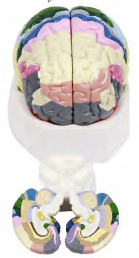 ■ 功能:大腦作正中矢(shǐ)狀切麵,左側大腦半球作水平切麵(miàn),並剖開顳葉, 顯示間腦;小腦作矢狀剖麵;按照醫學本科統編教材設計,按不同功能部位進行定位,並用顏(yán)色加以區別;