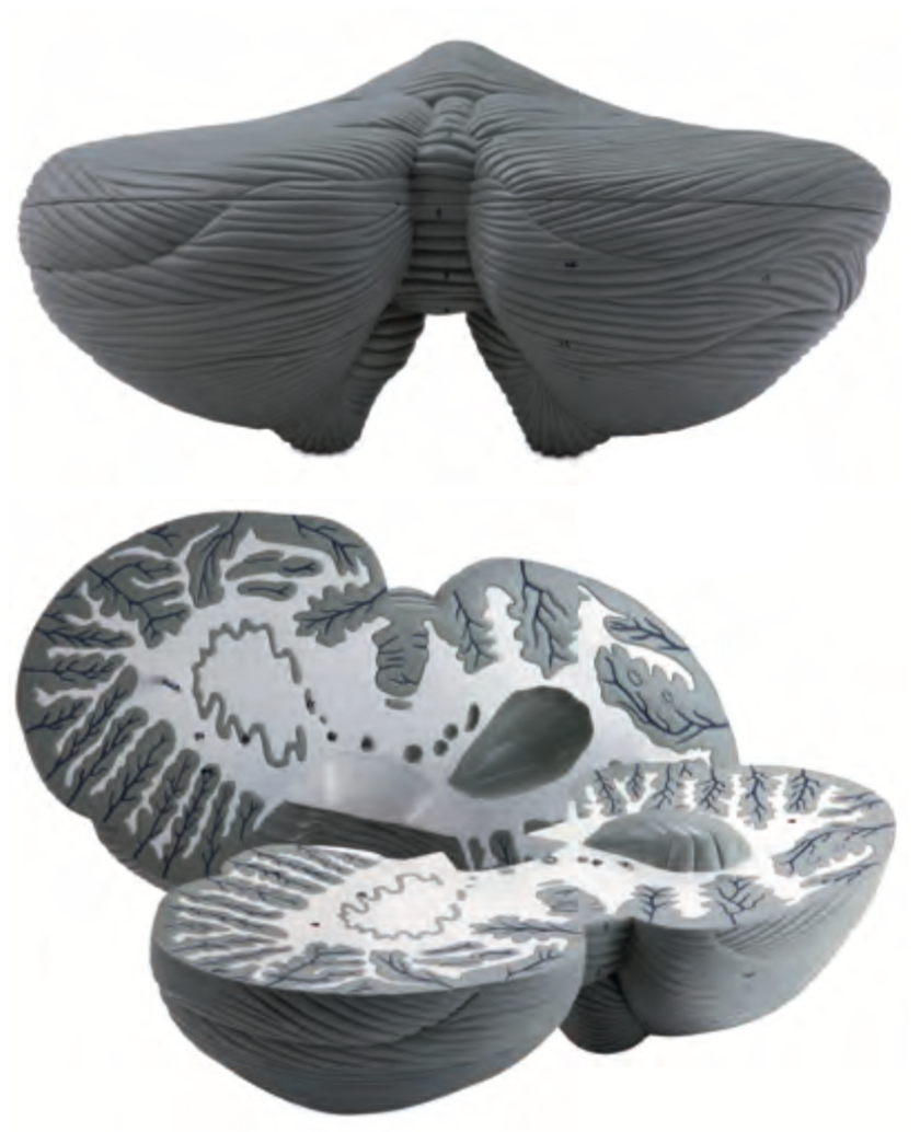 ■ 功能:顯示小腦的外形和內部結構。小(xiǎo)腦(nǎo)水平切麵可顯示小腦內(nèi)部結構, 包括小腦中(zhōng)央(yāng)核(頂核、球狀核(hé)、栓狀核和齒狀核)等結構;
