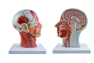 ■ 功能:模型顯示了(le)人類頭部(bù)和頸部的右半部分,沿著垂直麵剖切。淺層(céng)解剖暴露麵部肌肉、麵部和頭皮的淺層血管和神經分(fèn)支、腮腺和頜下腺。正中解剖暴露(lù)了大腦及(jí)其內部結構,咽和上呼吸道(dào),頸椎的一部分;