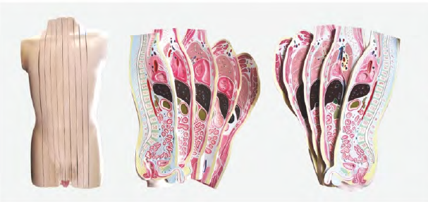 ■ 功能:顯示(shì)人體男性矢(shǐ)狀斷麵解剖模型結構和形態,將人體從頸根部到盆部整個軀幹分解成10片典型部分的結構,自正中(zhōng)矢狀斷向左右各分切5片,計10片;