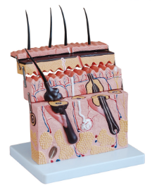 模型顯示了(le)皮膚的不同(tóng)層次,用於(yú)學習頭發(fā)、汗腺、皮膚感覺器官等基礎知識