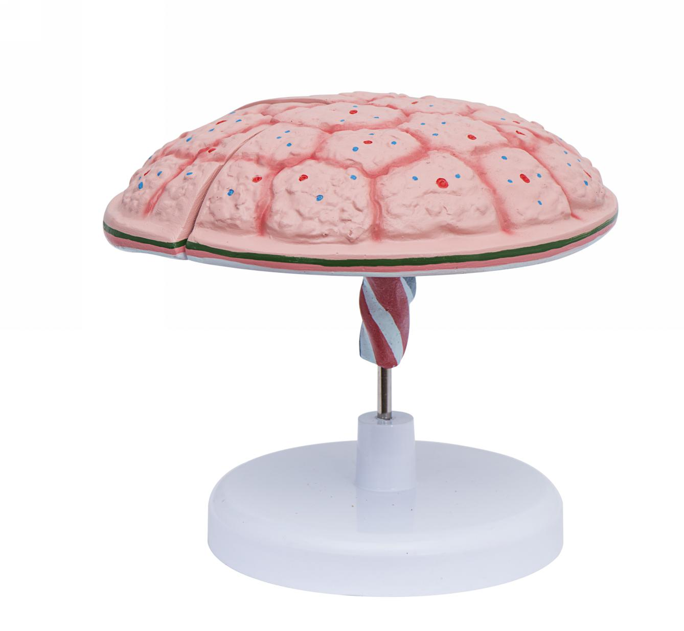 ■ 功能:胎盤及(jí)臍帶;可(kě)見胎盤分母體麵及胎兒麵。胎兒麵上有臍帶附著。臍帶內見(jiàn)有一根(gēn)臍靜脈(mò)及兩根臍動脈。母體麵可見分多數胎盤小葉(yè)。在胎盤斷(duàn)麵上,可見有母(mǔ)體胎盤(紫色)(基(jī)蛻膜)、胎兒胎盤及絨毛血間隙(褐色)母(mǔ)體胎盤上還有胎盤中隔。胎兒胎(tāi)盤由羊膜(青色)、絨毛膜(由著(zhe)粉(fěn)紅色的胎生結締(dì)組織及著綠色的滋養層形成)。並(bìng)可見由絨毛(máo)膜發出多(duō)數絨毛幹及絨(róng)毛。在母體胎上(shàng)可見子宮動靜脈(mò)開(kāi)口於絨毛血間隙。在胎兒胎(tāi)盤上,可(kě)見臍動(dòng)脈分枝(zhī), 最後入於絨毛中軸(zhóu)(中間連以毛細血管);