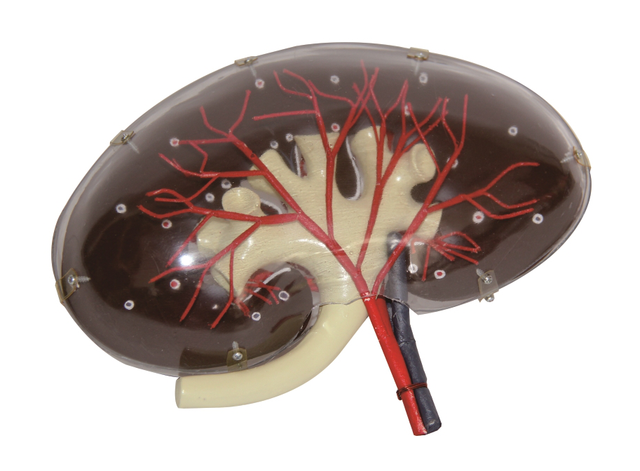 ■ 功能:模型用透明有機(jī)玻璃外殼顯示腎(shèn)外形特征,腎內部的腎實(shí)質額狀切麵示皮質、髓質(zhì)及(jí)腎乳頭(tóu)與腎小盞關係(xì)、腎竇(dòu)部的腎小盞,腎大盞及腎盂,腎動脈前後(hòu)兩支在腎實質內腎段動脈分布特征,腎蒂主要結構腎動脈、腎(shèn)靜脈、輸尿管的排列關係;