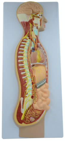 功能(néng):模型按成人實際標本大小塑製而成,顯(xiǎn)示自主(zhǔ)神經(jīng)係統結構全貌,自主神經係統由交感神經和(hé)副交感神經組成(chéng),模型中交感神經呈黃色(sè),副交感神經呈白色。顯示(shì)的結構:大腦、麵神經、三叉神經(jīng)、額神經(jīng)、淚(lèi)腺神經、眶下(xià)神(shén)經、牙神經 、舌神經、氣管、食管腮(sāi)腺、舌下(xià)腺、甲狀腺、頸內動脈叢、頸神經、主動脈、腔靜脈  肺動靜脈 、心  、心叢(cóng)  灰白交通支、腹腔(qiāng)神經、腰骶神經節、腸係膜神經等;