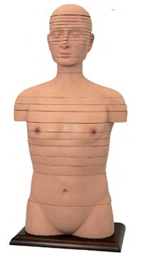 ■ 功能:這個(gè)真人大小的(de)軀幹模(mó)型被水(shuǐ)平切成24塊,給出了計算機斷層掃描和磁共振的工作原理。每個切片都可以(yǐ)旋轉和移除,以更仔細地檢查其解剖細節,包括肌肉、神經在內的所有結(jié)構都在隨附的手冊上進行了編號和識別(bié);