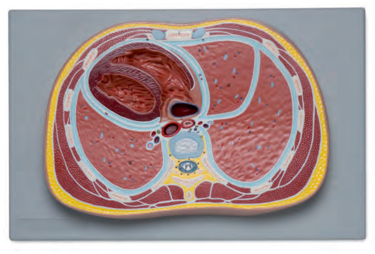 ■ 功能:模型示約第三胸椎高度示斷麵結構,按正常解(jiě)剖姿(zī)態平下縱隔(gé)作一橫(héng)切,示肺裂,肺部的動(dòng)脈、靜脈(mò)、支氣管的斷麵關係(xì)、胸膜、肋間肌及前側(cè)、左右側胸廓肌肉,同時還可示脊柱、脊髓通過此平麵的結構、毗鄰關係(xì)等,前方示(shì)左右心房、心室等;