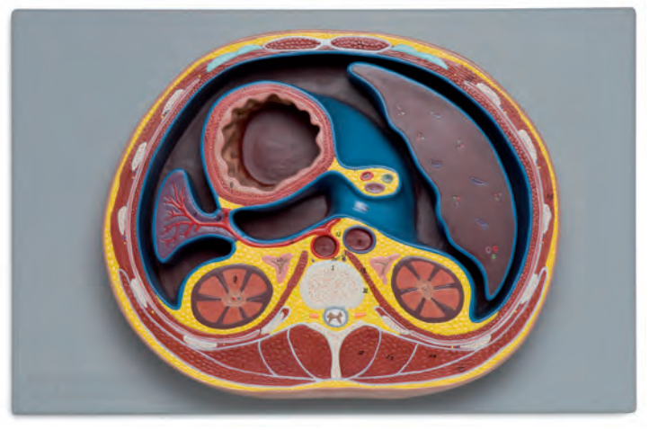 ■ 功能(néng):產品按正(zhèng)常解剖姿勢在平網膜孔的位置作一橫切,主要(yào)顯(xiǎn)示(shì)腹腔髒器、腹膜與網膜孔的位置關係,網膜孔是(shì)大腹膜腔通入網膜囊的唯一孔道,前主為肝十二指(zhǐ)腸韌帶,後方為下腔靜脈的腹膜,上界(jiè)為肝的尾狀葉(yè),下界為十二指腸球部,在消化道穿孔或實質(zhì)性髒器損(sǔn)傷,其內容物及其血液可經(jīng)網膜孔流入網膜囊內,同時還可示胃、腎、脾、肝橫斷麵諸(zhū)結構及其網膜孔與腹膜腔的通道關係、平網膜孔各髒器的毗鄰關係等;