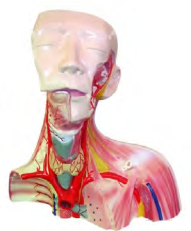 功能:模型上端(duān)自眉弓上方約3cm向顱後至人字縫交叉處作一水平橫切,下端平第(dì)五肋作一水平(píng)橫切。在顱腔內(nèi)示:腦神經的出顱位置,基底動(dòng)脈,大腦前、中、後動脈起始段,右側頸部主要示:頸總動脈,椎(zhuī)動脈,甲狀(zhuàng)頸幹,頸淺動脈,甲狀腺上、下動脈,舌動脈,麵動脈,頸內動(dòng)脈,頸外動脈(mò)及上頜(hé)動(dòng)脈的(de)分支,行走經(jīng)過(guò),營養範圍,同時,還可顯示甲狀腺,喉軟骨,下頜下腺, 頸(jǐng)叢神經的形態、位(wèi)置等,在胸(xiōng)部主要示氣管、支氣管、主動脈弓及(jí)其分支,肋間血管神經,鎖骨下動脈,腋動脈(mò)等;