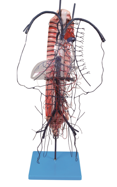 功能:顯示門靜脈的合成,屬(shǔ)支及門(mén)靜脈吻合情況,模型上可見到門靜脈是由腸係膜上靜脈和(hé)脾(pí)靜脈合成,經肝門(mén)入肝, 在肝內反複分支成毛細血管,然後再匯集成三支肝靜脈經第二肝門出肝,在腔靜脈窩內注入(rù)下腔靜脈。模(mó)型上的門(mén)靜脈(mò)屬支尚有胃冠(guàn)狀靜脈、胃右靜脈、附臍(qí)靜脈以及注入脾靜脈的腸係膜下靜脈等。此外,在盆腔內可見到直腸(cháng)靜脈叢及直腸上、下靜脈;在胸腔(qiāng)內可見食(shí)管靜脈叢及奇靜脈和半奇靜脈;在胸腹壁上可見到臍旁靜脈叢及胸腹壁(bì)上、下靜脈、腹壁淺靜脈和胸腹壁(bì)靜(jìng)脈;
