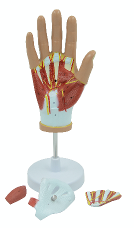 ■ 功能:此模型(xíng)掌腱膜和掌短肌(jī)可(kě)以拆下來,以觀察更深層的肌(jī)肉,肌腱,血管和神經網絡。深層的掌部(bù)斷麵出(chū)示了(le)長腱、腕部韌帶及正中神經。手掌肌部分拆下後,可以看(kàn)到手掌弓及其分支和神經分布;