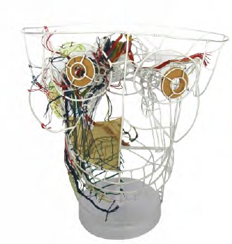 ■ 功能:模型由鐵絲串製成頭顱(lú)外形,顯示神經核(hé)團和副交感神經的聯係分布(bù)等結構,並(bìng)顯示頭部動脈、靜脈和神經等結構;