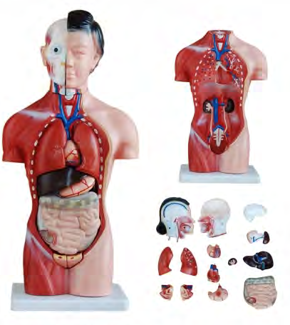 ■ 功能:顯示女性人體內(nèi)髒器官的位置及頭部解剖的形態和構造,表現呼吸、消化、泌尿(niào),生殖 等主要人體解剖(pōu)係統。頭頸右半(bàn)側顯示顱骨、咬肌、顳肌等(děng)結(jié)構,眼眶內(nèi)有(yǒu)眼(yǎn)球,在(zài)頭頸部作(zuò)矢狀切(qiē)麵,顱腔容納腦的右(yòu)半球,腦的(de)腹(fù)側麵(miàn)有十二對腦神(shén)經,示鼻腔、口腔、喉部示(shì)喉腔,喉室、聲門裂、甲狀腺的外側葉後麵示(shì)甲狀旁腺。胸腔內的兩肺額狀切麵,顯示肺內結構,心髒作冠(guàn)狀解剖,表示左(zuǒ)右房室的構(gòu)造異同,心髒血管有上下(xià)腔靜脈,肺動靜脈,主動脈,供講解大小血液(yè)循環應用;