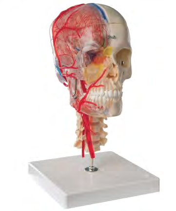 ■ 功能:模型為成人頭顱骨帶7節頸椎,置於底座(zuò)上;動脈突顯於一邊,神經為另一邊。頭(tóu)蓋骨可拆卸以顯露顱底主要神經和大動脈,12根大(dà)腦神經以及其分支也清晰顯露。
