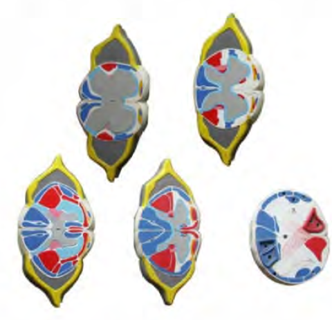 ■ 功能:模型按照1952年REXED首次提出的脊髓灰質構築分層的概念,將脊髓灰質分成大(dà)致平行的9層和圍繞中(zhōng)央管的第10層。脊髓灰質後角為Ⅰ-Ⅵ層,中間帶為 Ⅶ層,前角(jiǎo)為Ⅷ-Ⅸ層,Ⅹ層圍繞中央管周圍。由神經元的胞體、突起和神經膠(jiāo)質及血(xuè)管等組(zǔ)成。顯示脊髓的切片,在切片上可以較明顯的(de)看到內部呈H行的灰質,其周(zhōu)圍包裹著白質。模型還顯示灰質前連合、後連合,前(qián)角、後角,中間帶、中央管等主要(yào)內部構造;