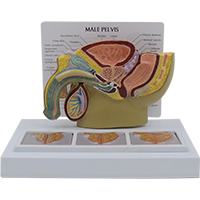 ■ 功能:縮小的男性(xìng)骨(gǔ)盆矢狀切麵居中。底(dǐ)部(bù)顯(xiǎn)示三個三維橫截麵前列(liè)腺。切(qiē)片代表(biǎo)良性前列腺增(zēng)生(良性前列腺增生/前列腺肥大)的階段(正(zhèng)常、中度、晚(wǎn)期(qī));